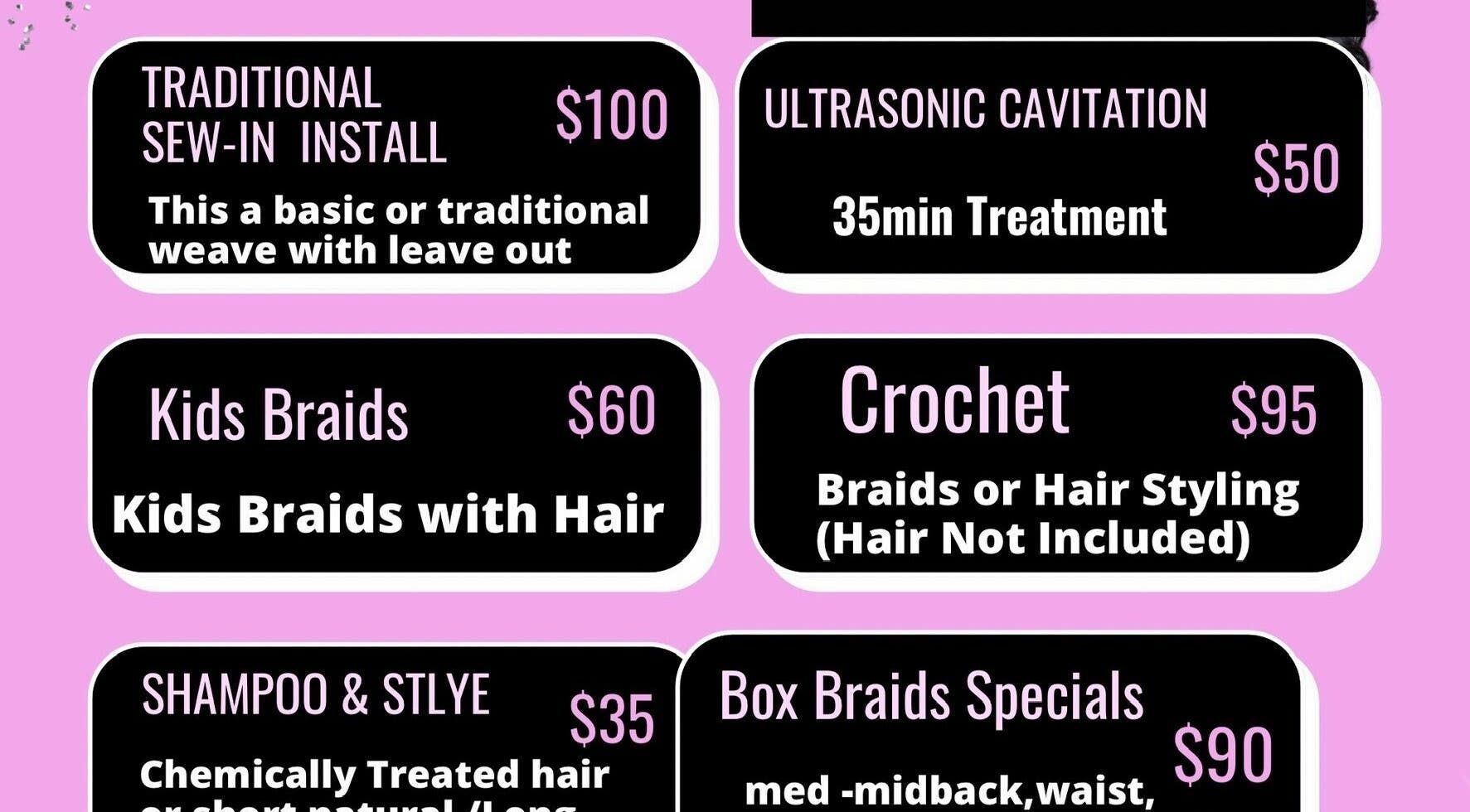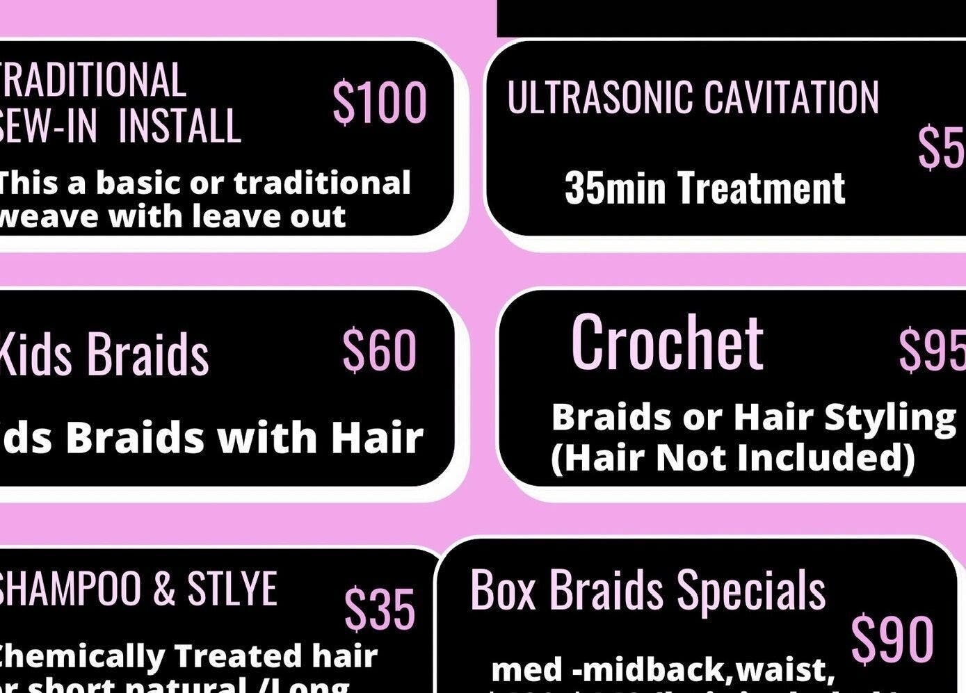 Laced with Glam Spa Salon is a Full Service Salon in Commons Mall we specialize in all your salon needs anything from Hair Styling Hair Cuts Relaxers Hair Straightening to Hair Braiding Eyelash Extension Body Sculpting, Foot Detoxification Sauna Wraps We even off Wifi cable television music while being servicing Luxury Robes and Slippers for Body services LED services a Laced with Glam Fashion store in our Rear where you also can shop and get your day or night wear after your services per body sculpting custom waist trainers and workout outfits to help get you motivated follow up items forsale