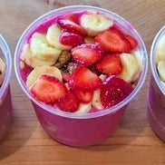 Fruit smoothie bowl topped with fresh fruit, granola.