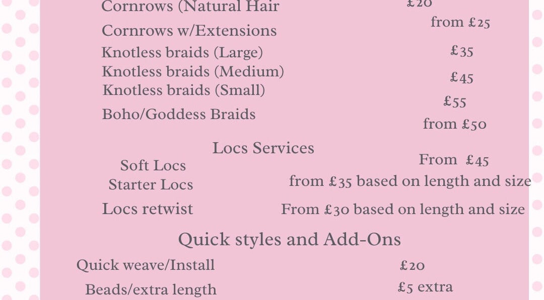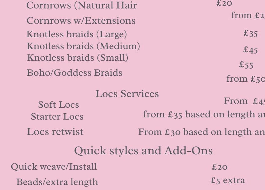 Luchi’s braid diary is your go-to spot for clean, stylish, and affordable braiding. From knotless and boho braids to soft locs, cornrows and quick weaves. I offer extra services like blow drying, prepping of extensions and colour blending to make your hair day smooth and stress-free. Quality work, fair prices, and a vibe you’ll come back for.