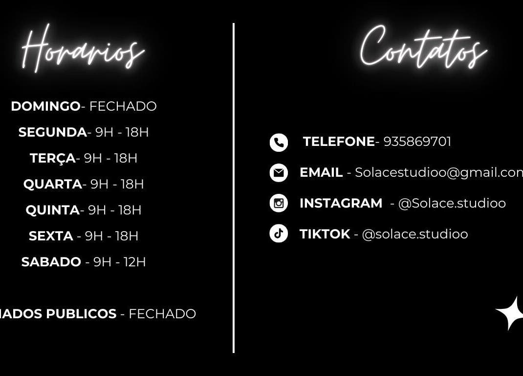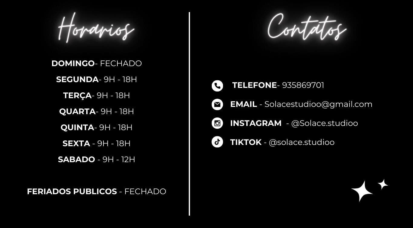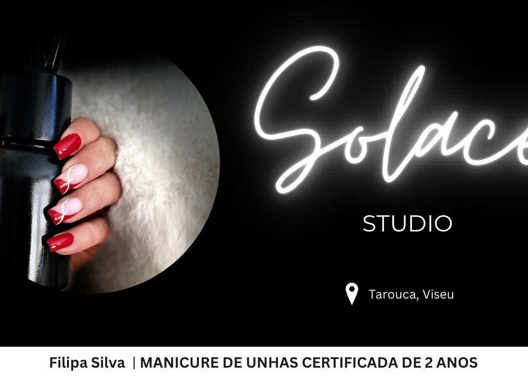 Bem-vindo ao Solace Studio! ✨ O nome ‘Solace’ vem de consolo e alívio, e é isso que quero oferecer a você. Meu estúdio é um espaço pensado para trazer bem-estar, relaxamento e carinho. Aqui, cada visita é uma experiência de cuidado e renovação, onde você pode se desconectar do mundo e se reconectar com seu melhor eu. ✨ Marque já e venha viver essa experiência única de tranquilidade e beleza!