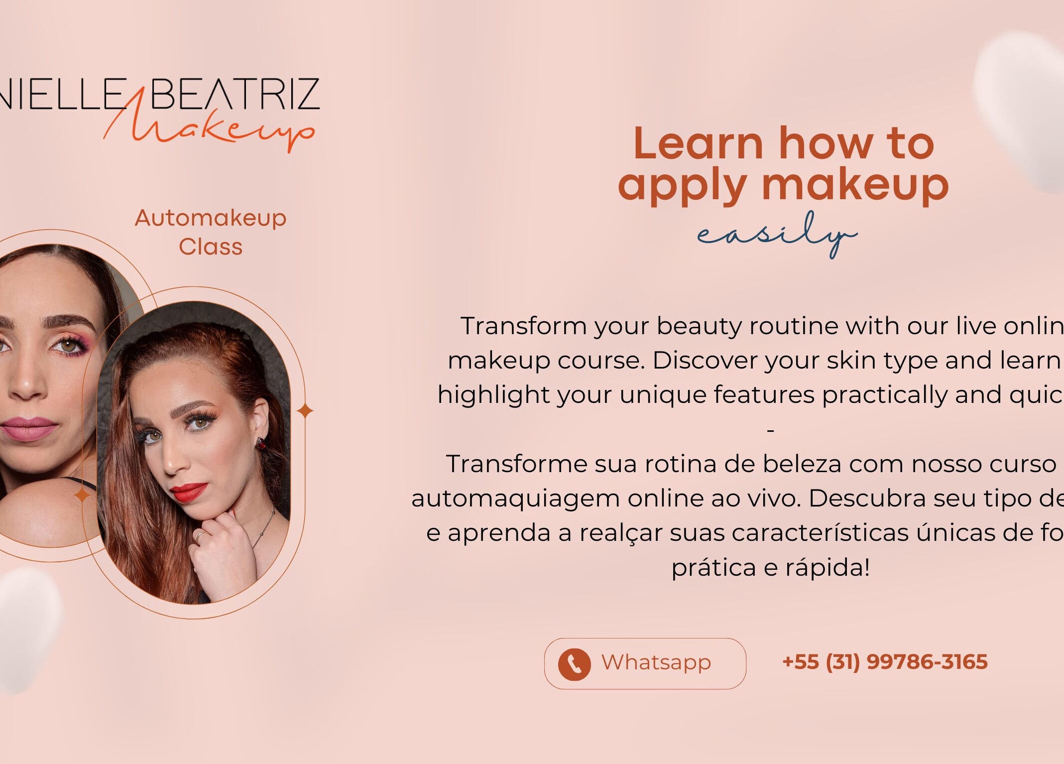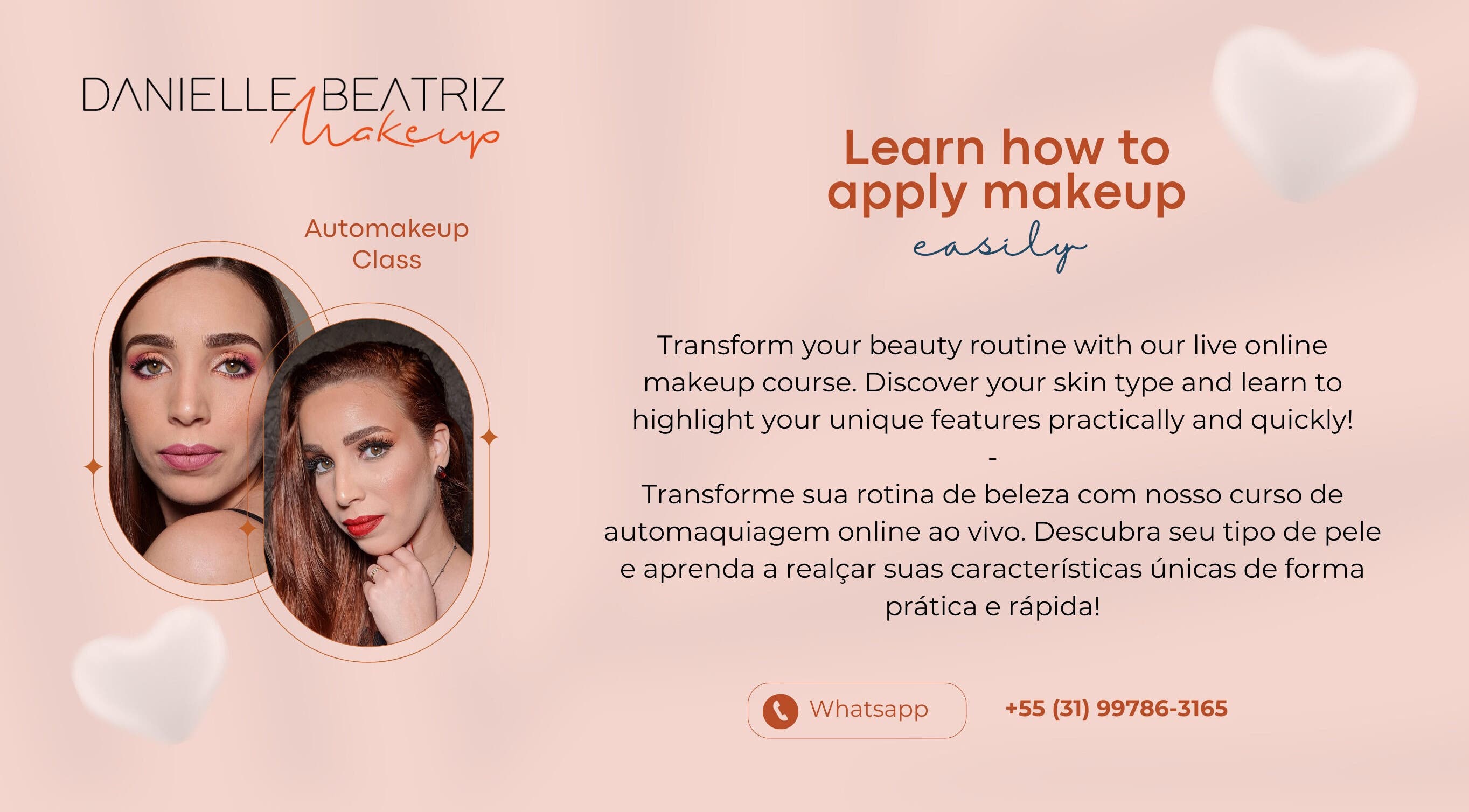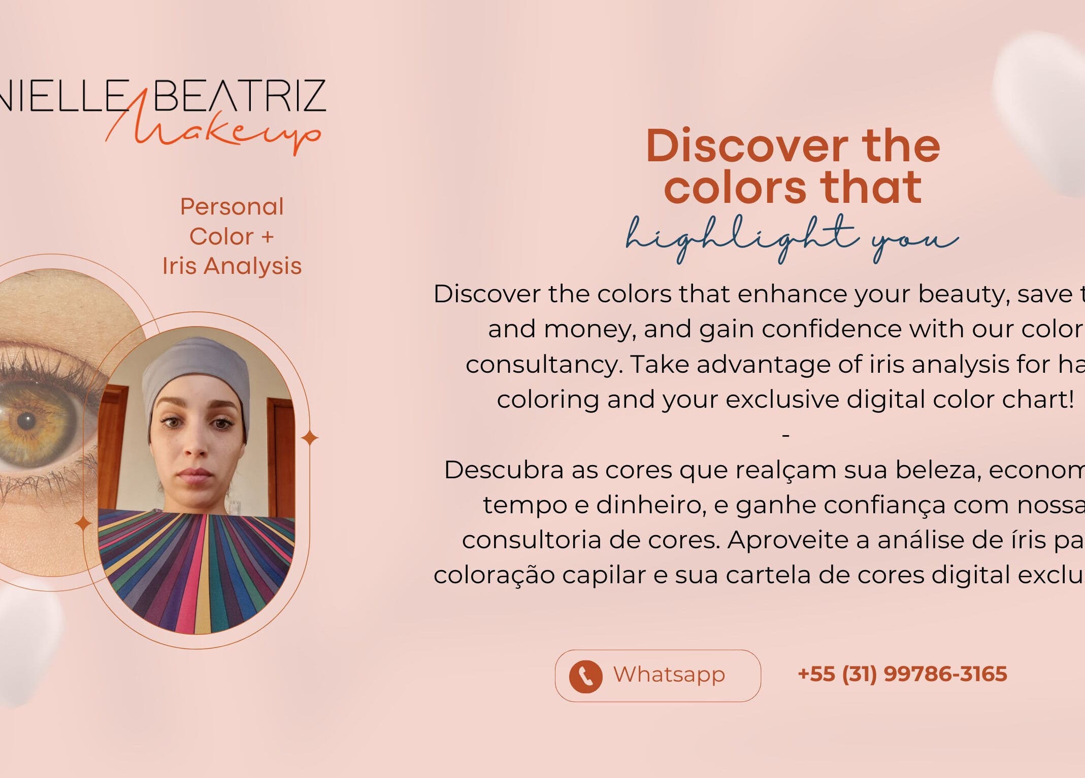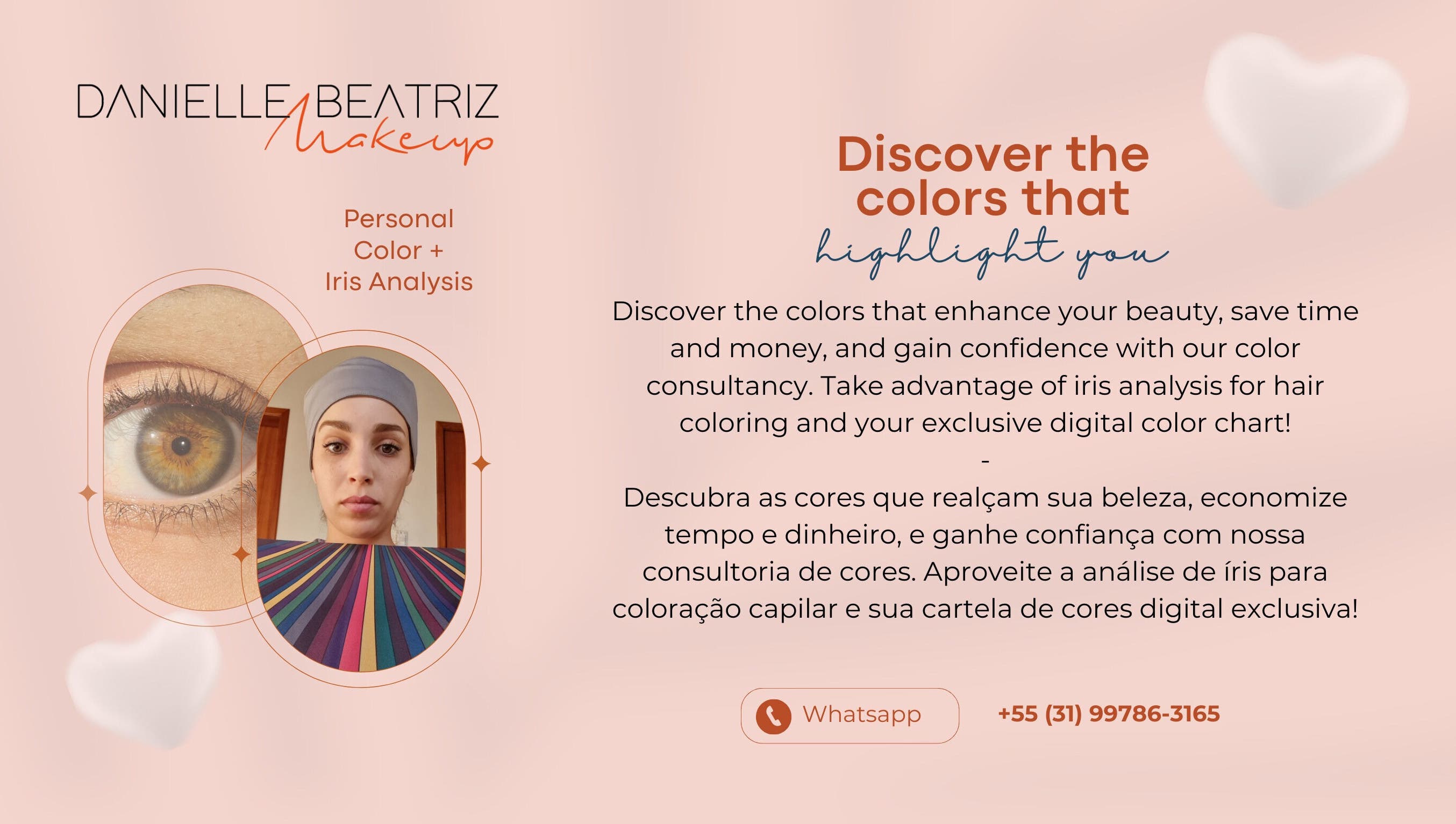 Makeup, Visagism and Personal Colour. I enhance your natural beauty in the comfort of your home and I help women feel more confident through makeup and colouring. 7 years embellishing dreams! English or Portuguese (BR). Maquiagem, Visagismo e Coloração Pessoal. Realço a sua beleza natural no conforto da sua casa e ajudo mulheres a se sentirem mais confiantes através da maquiagem e colorimetria. Há 7 anos embelezando sonhos! Inglês ou Português (BR).