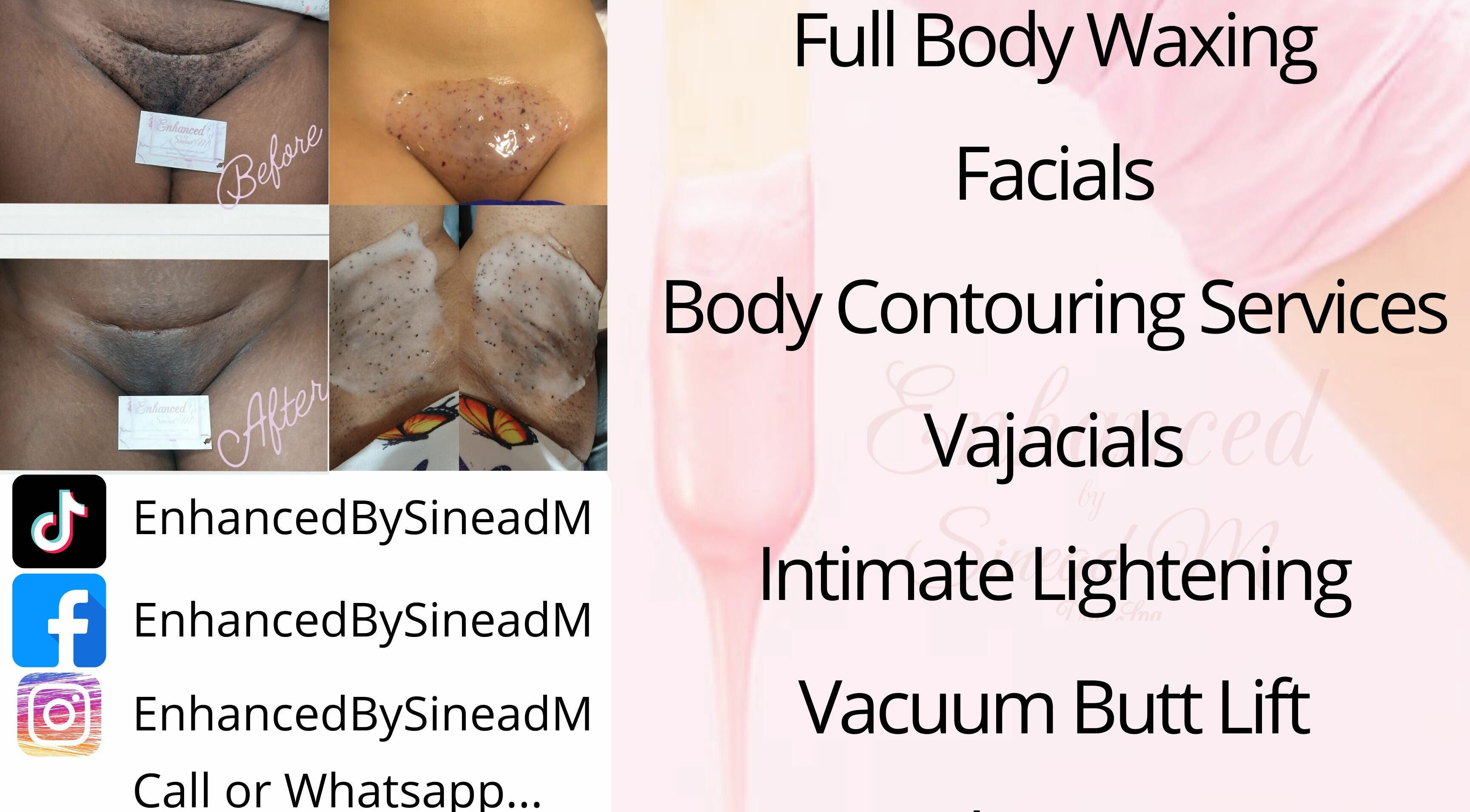 Treat yourself to a highly deserved moment of "šš®" time. At Enhanced by SineadM we offer the best personal care treatments like Facials, Waxing, Body Sculpting, Vajacials, Laser Hair Removal, Intimate Lightening and more.