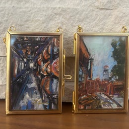 Hand-signed bourbon ornament featuring a rickhouse and distillery in a gold/glass frame.