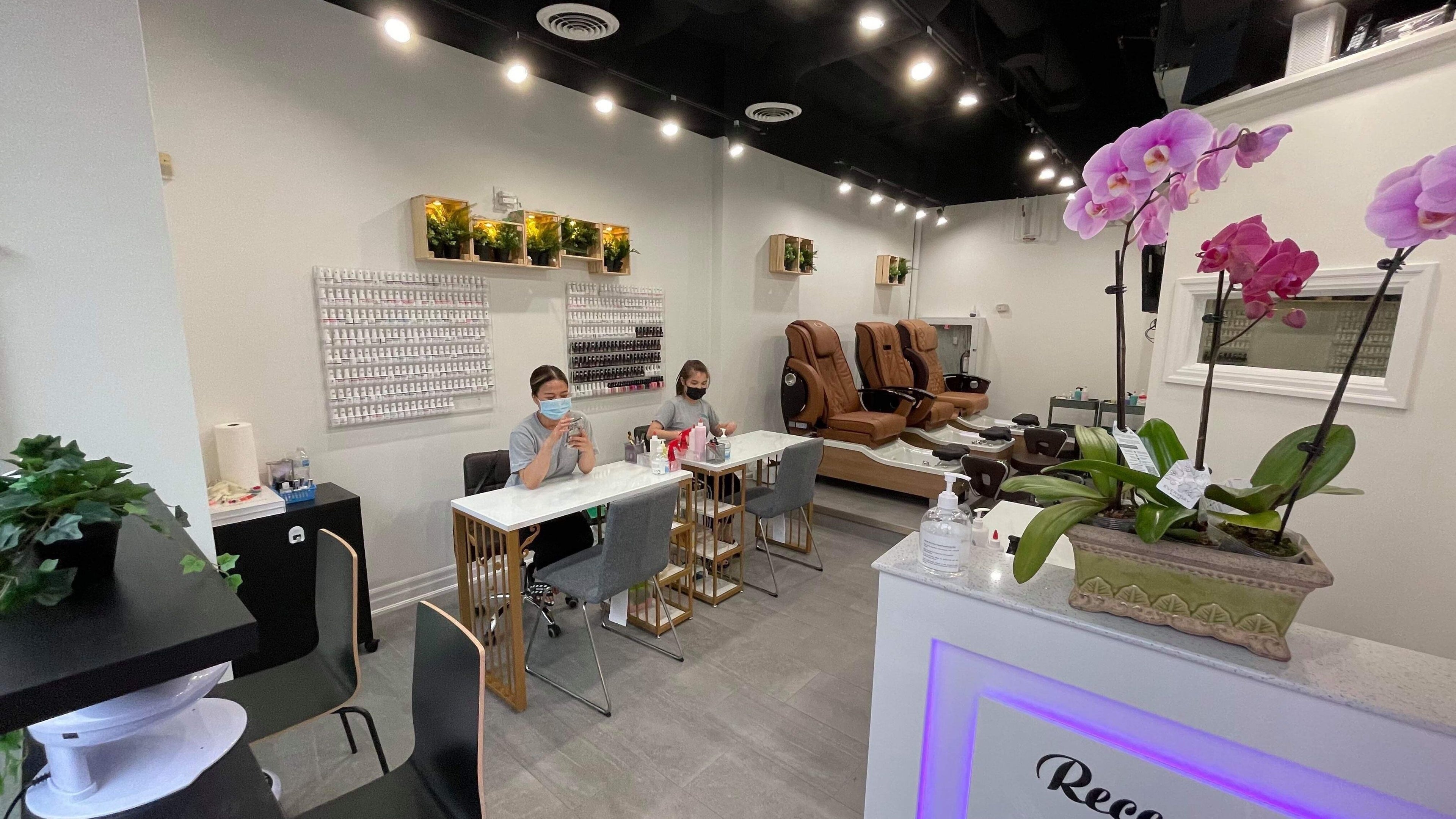 Stylish interior of Pearl Nail Bar College (534 College St) in Toronto, Ontario, CA with chic seating and decor.