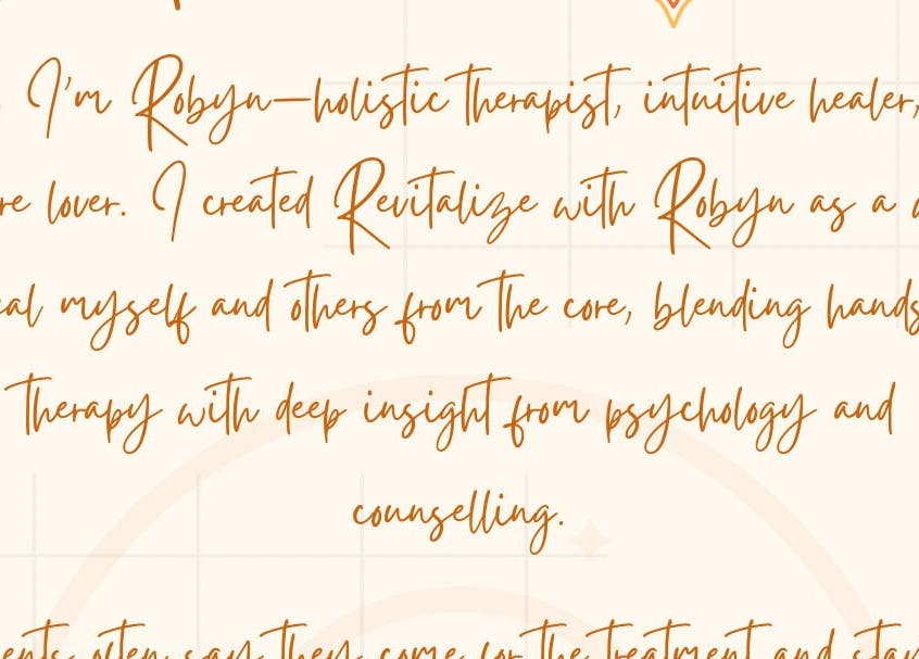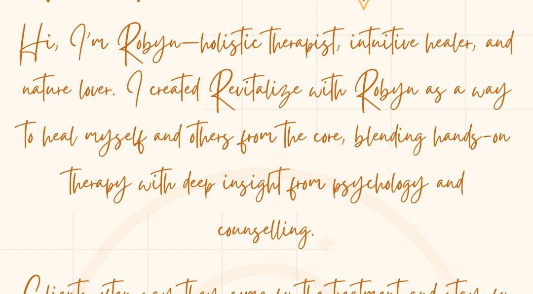 Hi, I’m Robyn – the heart behind Revitalize with Robyn. I’m a holistic therapist with a deep-rooted passion for helping others heal from the inside out. What started as a journey to heal myself naturally grew into a space where I could support others—physically, emotionally, and energetically.